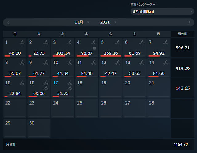 11/20金に日田往復で170kmくらい走る予定。11/19木もいつも通りの朝練で45kmほど走る予定なので、今週平日の予定距離は210km程度。今週末以降での残りが140km程度となるので、これなら来週平日普通に走れば到達できる距離である。